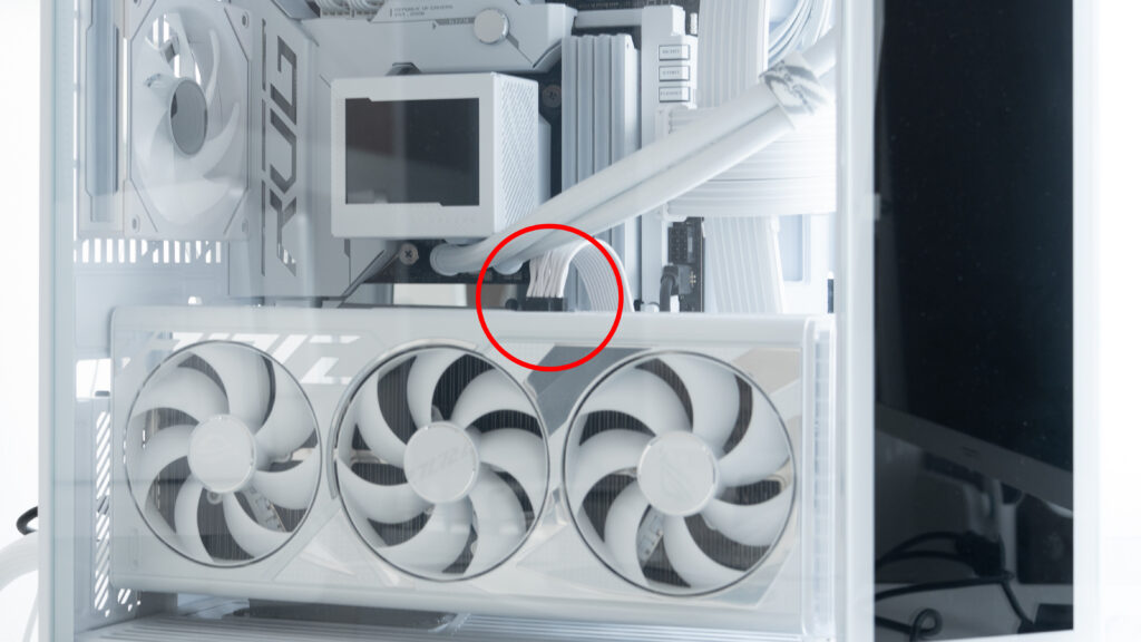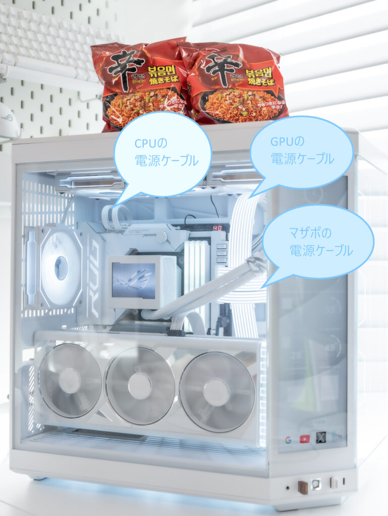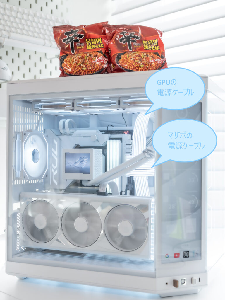 このPCのグラボに接続している電源ケーブルがあるんですけど、このケーブルがちょっとだらしないんですよね。