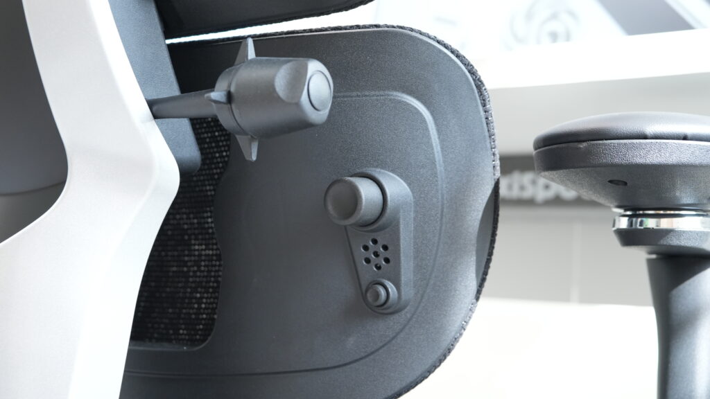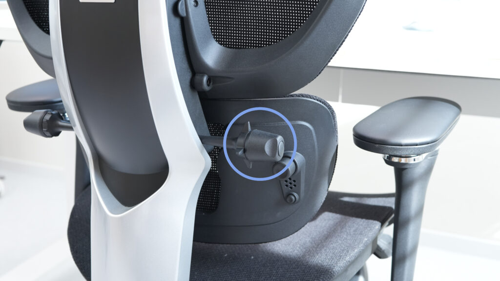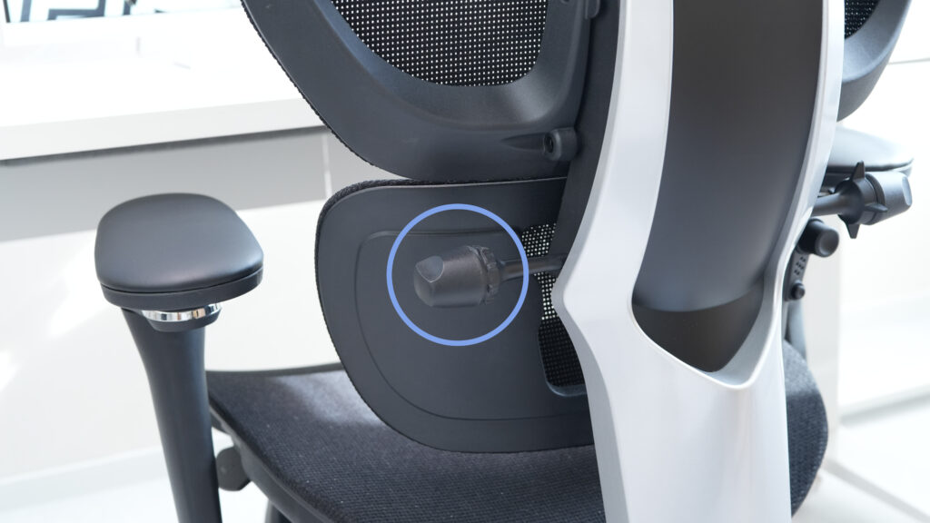 なんだけど、たまにリクライニングしたときに、ランバーサポートのこの部分、ここの奥のプラスチックに腰がぶつかることがある。(メッシュの張りが弱い?)
